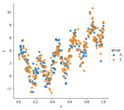 It generates variables from a distribution. The metric we care about is $y$, and the group assignment is given by the group column. There is also a covariate $x$, but for now we will ignore it.